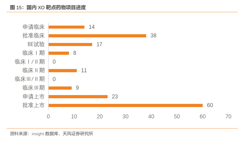 XO靶点药物管线布局全面。当前XO靶点药物研发管线:已上市产品有60款,23款处于上市申请阶段,临床III期及II期项目分别有9个和11个,I期及BE试验阶段项目25个,后续管线中38款获批临床、14款临床申请已提交。从临床前到申请上市,XO在研项目多达百余项。