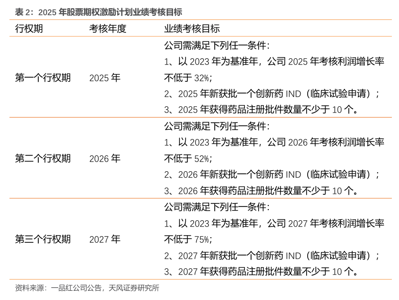 员工股权激励充分。为了进一步健全公司长效激励机制,吸引和留住优秀人才,充分调动公司核心团队的积极性,一品红制定了股权激励计划。在2025年2月11日发布的2025年股票期权激励计划中,激励对象共计353人,为公司核心骨干员工。为实现公司稳健发展与激励效果相统一的目标,公司董事会制定了严格的业绩考核要求。考核年度为2025-2027 年,公司需满足以下任一条件:2025年考核利润增长率不低于32%,或新获批一个创新药IND,或获得药品注册批件数量不少于10个;2026年考核利润增长率不低于52%,或新获批一个创新药IND,或获得药品注册批件数量不少于10个;2027年考核利润增长率不低于75%,或新获批一个创新药IND,或获得药品注册批件数量不少于10个。其中,业绩考核目标中的“考核利润”为归母扣非净利润与研发费用之和,并扣除对联营企业和合营企业的投资收益。该股权激励计划的实施将有效地将股东利益、公司利益和核心团队个人利益结合在一起,使各方共同关注公司的长远发展,确保公司发展战略和经营目标的实现。