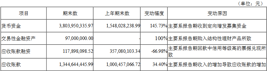 截至今年三季度末,捷佳伟创总资产127.01亿元,较上年期末增长36.82%。其中,货币资金为38.04亿元,较上年期末增长145.73%,主要系报告期收到定向增发募集资金;应收账款13.45亿元,较上年期末增长34.40%,主要系报告期收入的增加导致应收账款的增加;存货43.51亿元,较上年期末增长13.82%。