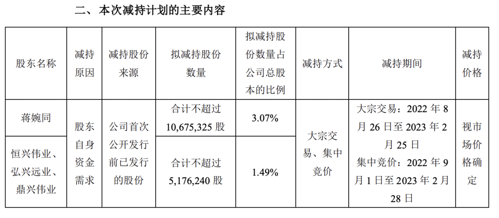 蒋婉同计划自今年8月26日-2023年2月25日以大宗交易方式,自今年9月1日-2023年2月28日以集中竞价方式,合计减持不超过1067.5万股,占该公司总股本比例3.07%。