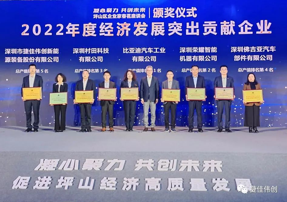 2月6日,坪山区举办“凝心聚力、共创未来”企业家春茗座谈会,会上宣读了《坪山区人民政府办公室关于坪山区2022年度突出贡献企业的通报》,其中捷佳伟创公司以坪山区企业总产值排名第5名的优异成绩,获评“2022年度坪山区经济发展突出贡献企业”。