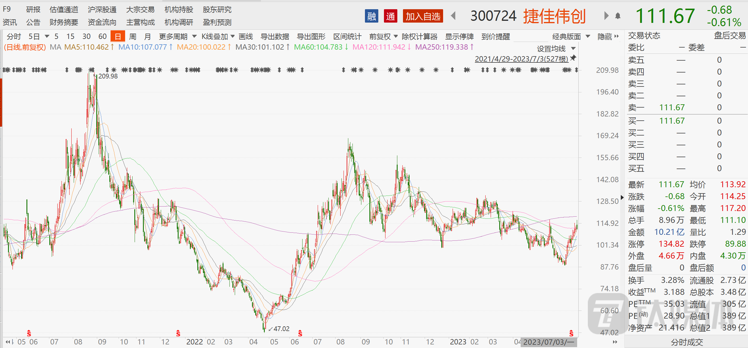一般来说,上市公司加码行业热点大概率可以为其股价上涨增加想象空间,然而事与愿违,今日公司股票小幅高开后震荡走低,截至7月3日收盘,股价报收于111.67元,下跌0.61%,总市值389亿元。
