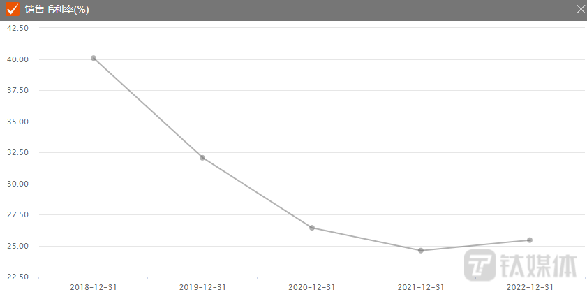 更让人担忧的是,近年来公司盈利能力也出现下滑趋势。2018年,公司毛利率可达40%以上。而截至2022年,公司毛利率已降至25.44%。此外,公司应收账款也正在逐年增加,截至2022年年底,公司应收账款高达到18.58亿元,创下历史新高。