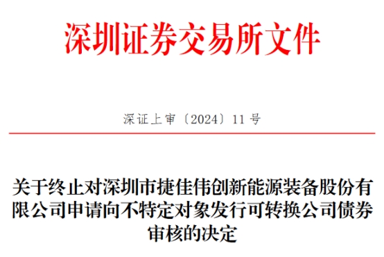 2024年1月11日,捷佳伟创和保荐人中信建投证券股份有限公司向深交所提交了《深圳市捷佳伟创新能源装备股份有限公司关于撤回向不特定对象发行可转换公司债券的申请》《中信建投证券股份有限公司关于撤回深圳市捷佳伟创新能源装备股份有限公司向不特定对象发行可转换公司债券的申请》,申请撤回申请文件。根据《深圳证券交易所上市公司证券发行上市审核规则》第二十条、《深圳证券交易所股票发行上市审核规则》第六十二条的有关规定,深交所决定终止对捷佳伟创申请向不特定对象发行可转换公司债券的审核。