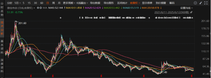 尽管捷佳伟创于4月23日交出了营收净利双增的成绩单,但对提振股价作用有限。公司仅4月24日收涨5.79%,此后连续三个交易日阴跌。4月24日至6月12日的区间跌幅为2.66%。截至6月13日发稿,报51.87元/股,市值较巅峰缩水超520亿元。