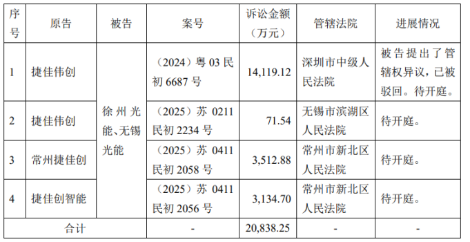 今年4月,徐州光能以设备延迟交付、设备不符合技术协议中约定的指标等事由对捷佳伟创及其下属子公司提起诉讼。目前,该案件尚未开庭。