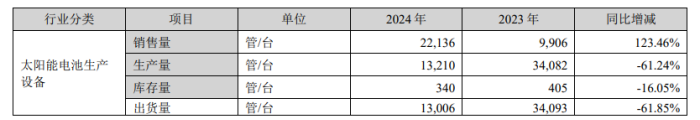 从产品销售情况不难看出端倪,2024年,太阳能电池生产设备销量同比高增123.46%至22136管/台,但设备生产量和出货量同比减少超六成。公司解释称,销售量增长主要系前期发货本期验收确认收入设备相较去年增加,生产量和出货量下降主要系受光伏行业整体情况影响,下游客户扩产放缓、订单下降所致。