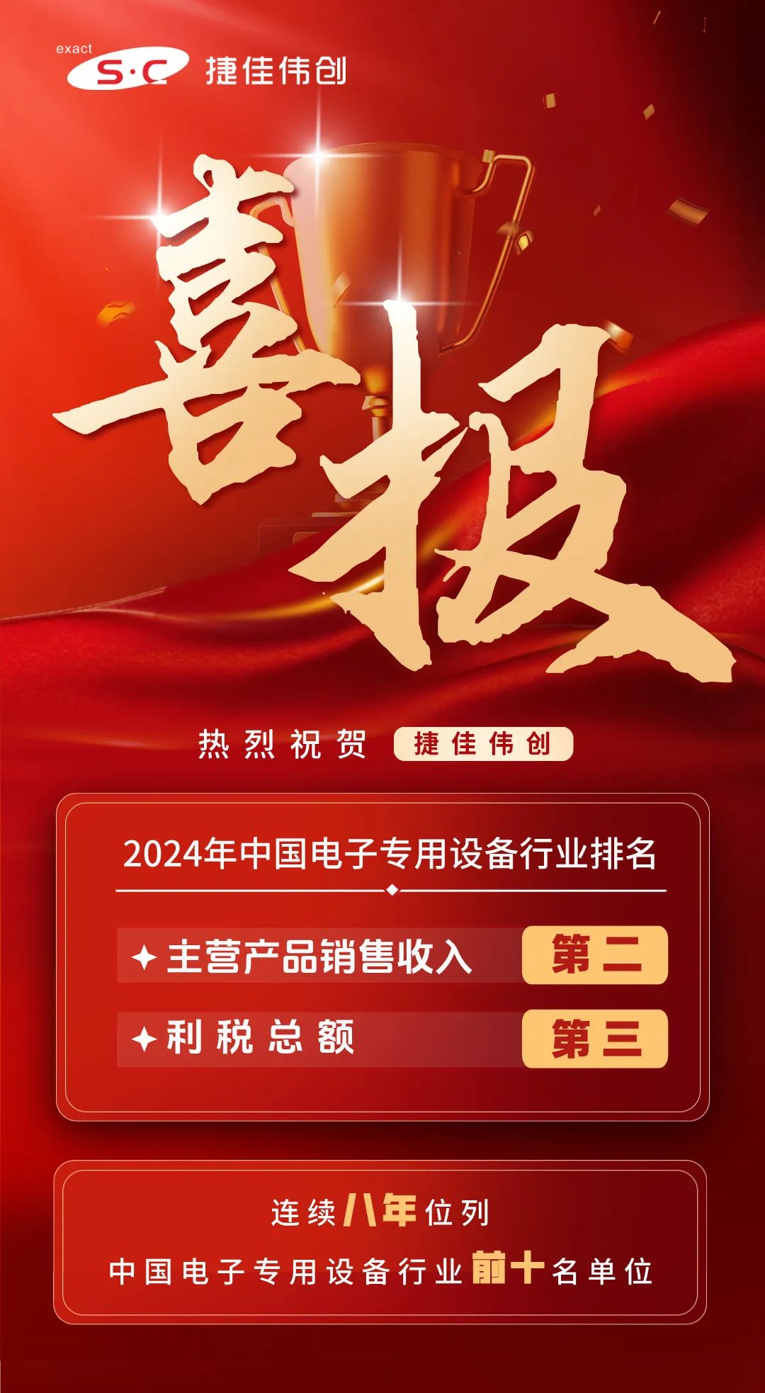 喜报!捷佳伟创位列2024年中国电子专用设备行业主营产品销售收入第二、利税第三!