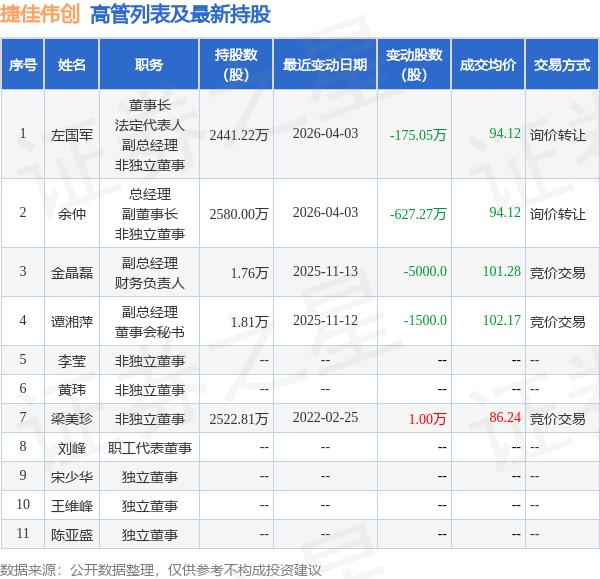 捷佳伟创近半年内的董监高及核心技术人员增减持详情如下: