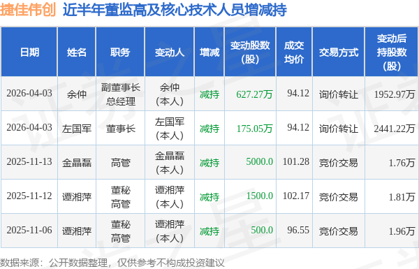 根据4月7日市场公开信息、上市公司公告及交易所披露数据整理,捷佳伟创(300724)最新董监高及相关人员股份变动情况:2026年4月3日公司董事长左国军、副董事长,总经理余仲共减持公司股份802.32万股,占公司总股本为2.3036%。变动期间公司股价下跌3.6%,4月3日当日收盘报103.42元。