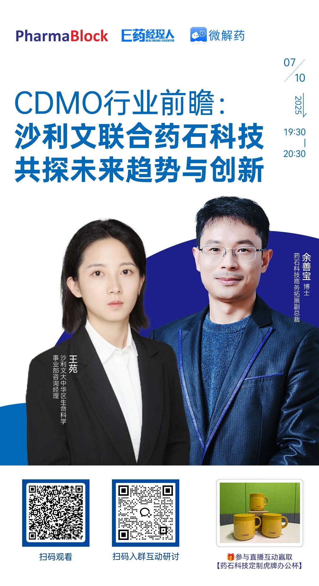 近日,沙利文发布《2025中国医药CDMO行业发展洞察蓝皮书》,不仅深入剖析了全球及中国CDMO行业的宏观环境与产业格局,更对药石科技多维度予以权威推荐。恰逢此时,一场以“CDMO行业前瞻:沙利文联合药石科技共探未来趋势与创新”为主题的直播如期启幕。本次直播由药石科技与沙利文联合推出,特邀药石科技商务拓展副总裁余善宝博士,以及沙利文大中华区生命科学事业部王苑经理担任嘉宾,围绕全球CDMO市场增长逻辑、一体化服务体系、新兴业务布局、绿色低碳技术及AI药物设计等核心议题展开深度探讨。