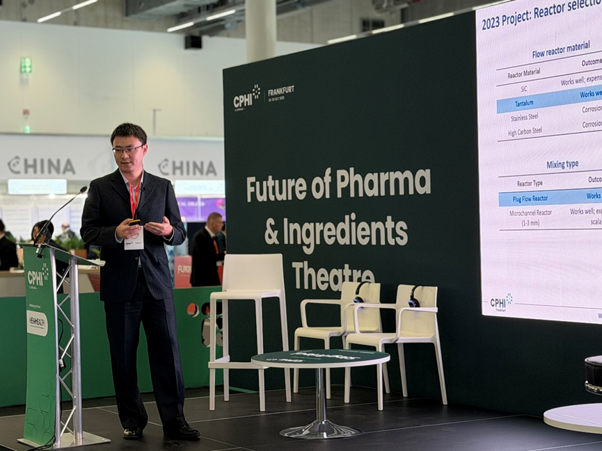 展会首日,药石科技工艺化学高级总监潘钟达博士带来题为Innovation for Sustainability: Continuous Flow Manufacturing Cases from the ACS Green Chemistry Award的主题演讲。