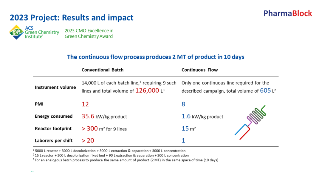 2023 ACS绿色化学奖项目针对年需求数吨级的药物关键中间体,传统批次工艺存在反应时间长、纯度不稳定、萃取效率低等问题,药石科技通过连续流技术优化实现技术突破。生产设备总体积从12.6万升降至605升,PMI从12降至8,能耗降低20倍,反应器占地面积从300平方米缩减至15平方米,单班人力从20人减至1人。