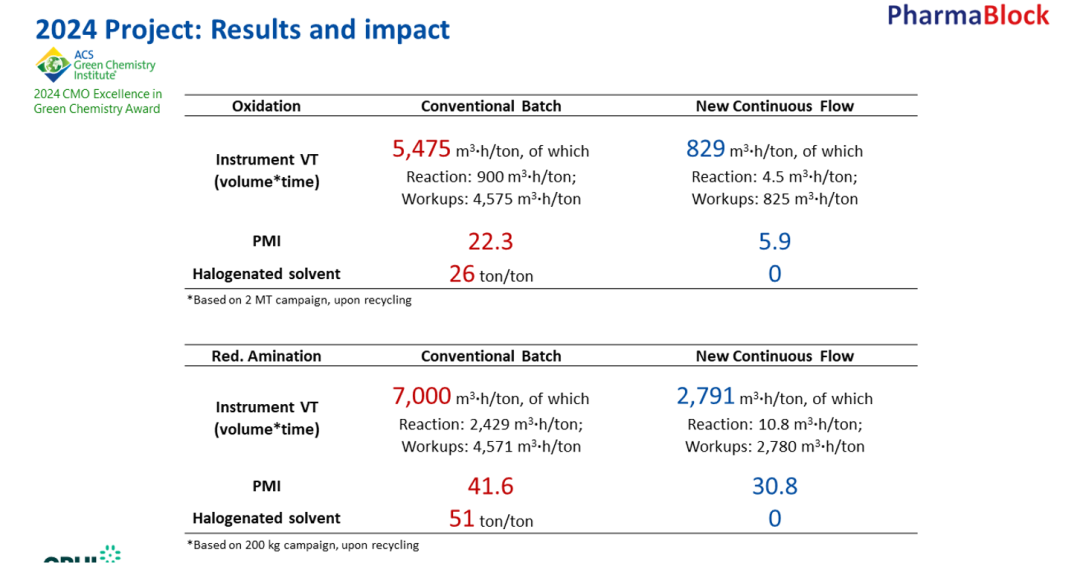 2024 ACS绿色化学奖项目:针对某API生产中的氧化与还原胺化步骤,传统工艺依赖危险试剂、卤代溶剂且产生大量废物,药石科技采用微填充床氢化结合自主研发催化剂的方案,不仅消除所有卤代溶剂,采用原子经济性氧化剂与还原剂,催化剂寿命超20天,还实现贵金属与溶剂循环利用。在效率上,20升反应器单日处理胺类物料超200千克,氧化步骤PMI从22.3降至5.9,还原胺化步骤PMI从41.6降至30.8,同时集成压力、温度、流量等实时监控系统,确保工艺稳定性与安全性。