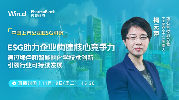 与此同时,作为Wind特邀的ESG优秀实践企业,药石科技同步参与Wind主办的中国上市公司ESG洞察专题路演,并由公司副总裁、EHS&S中心负责人揭元萍博士以《ESG助力企业构建核心竞争力》为题,围绕药石科技ESG实践、绿色创新成果及社会责任践行展开深度分享,系统呈现了药石科技以ESG驱动高质量发展的完整路径,为医药行业可持续转型提供了切实可鉴的实践样本。