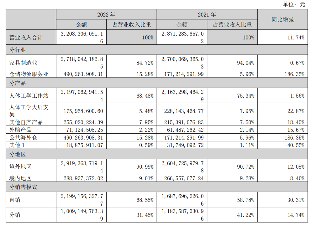 报告期内,乐歌股份实现营业收入32.08亿元,较上年同期增长11.74%;归属于上市公司股东的净利润2.19亿元,较上年同期增长18.44%。人体工学工作站仍是其营业收入的主要来源,实现收入21.97亿元。