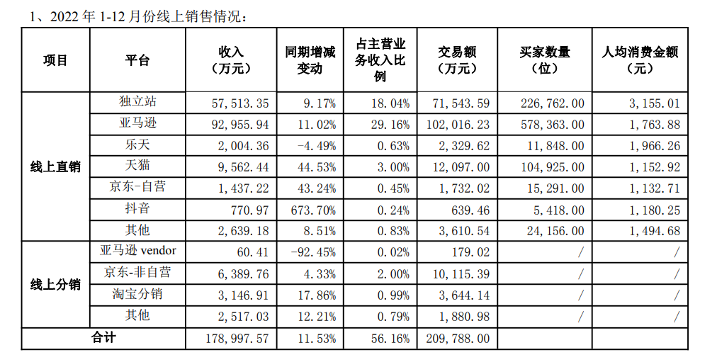 分地区来看,2022年乐歌股份境外地区营收29.19亿元,占营业收入比重为90.99%。乐歌股份线上收入合计17.9亿元,占主营业务收入比例为56.16%,交易额为20.98亿元。报告期内,乐歌股份自主品牌产品销售收入占主营业务收入(不含海外仓收入)比例为68.89%。