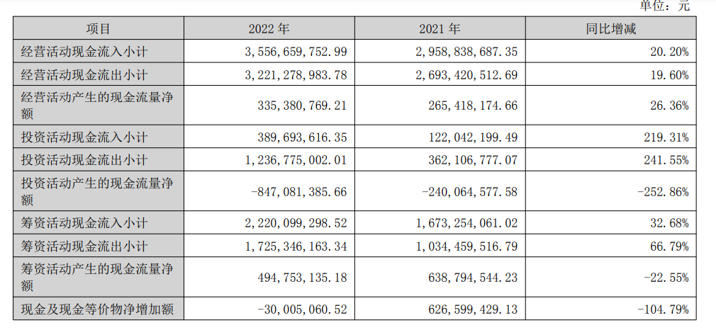 2022年乐歌股份经营活动产生的现金流量净额为3.35亿元,同比增26.36%;投资活动产生的现金流量净额-8.47亿元,同比降252.86%;筹资活动产生的现金流量净额4.95亿元,同比降22.55%。资料显示,2018年-2022年,乐歌股份投资现金流五连负。