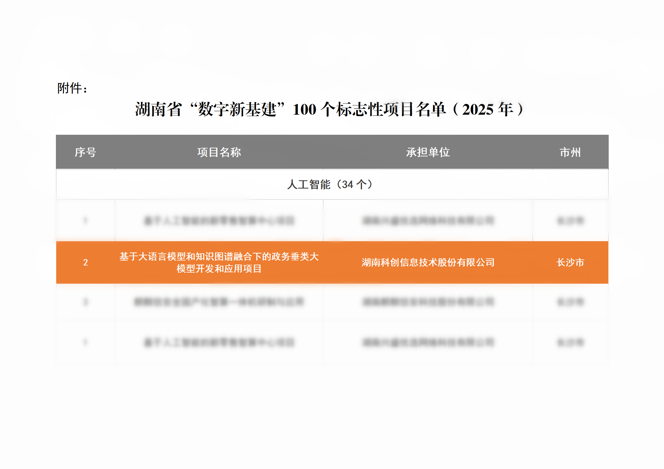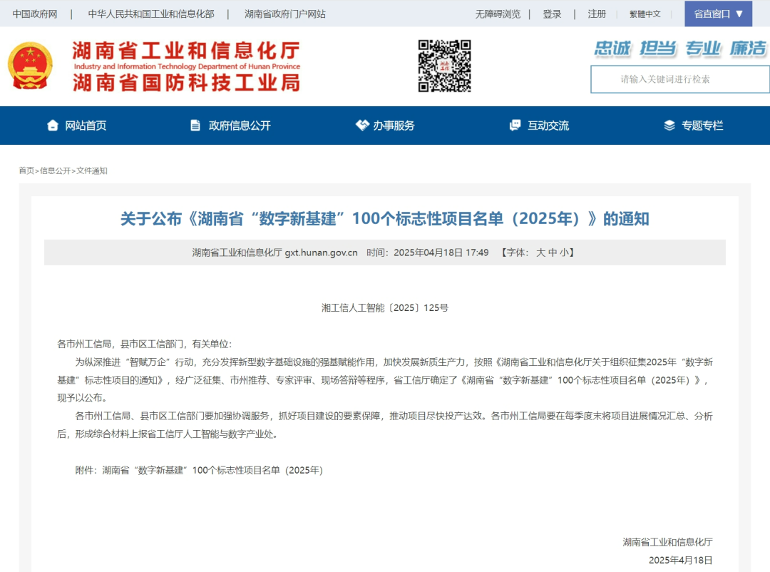 近日,湖南省工业和信息化厅正式公布《湖南省“数字新基建”100个标志性项目名单(2025年)》。