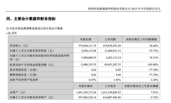 8月16日,深圳科创新源新材料股份有限公司(以下简称“科创新源”或“公司”)发布2024年半年度报告。报告显示,在报告期内公司实现了营业收入的大幅增长,但净利润却出现了显著的下滑。