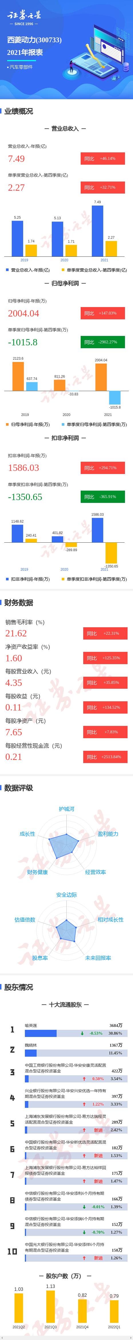 西菱动力2021年报显示,公司主营收入7.5亿元,同比上升46.14%;归母净利润2004.05万元,同比上升147.03%;扣非净利润1586.04万元,同比上升294.71%;其中2021年第四季度,公司单季度主营收入2.27亿元,同比上升32.71%;单季度归母净利润-1015.81万元,同比下降2902.27%;单季度扣非净利润-1350.65万元,同比下降365.91%;负债率43.93%,投资收益2.48万元,财务费用2209.96万元,毛利率21.62%。