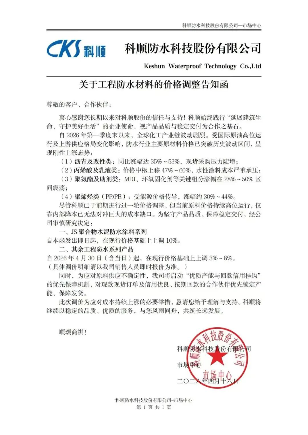 4月16日,科顺防水科技股份有限公司发布关于工程防水材料的价格调整告知函并称,经公司审慎研究决定:JS聚合物水泥防水涂料系列自本函发出即日起,在现行价格基础上上调10%。其余工程防水系列产品自2026年4月30日(含当日)起,在现行价格基础上上调3%~8%。