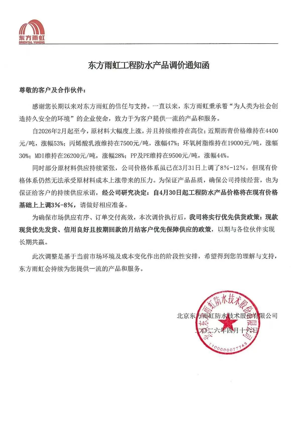 4月16日,北京东方雨虹防水技术股份有限公司发布东方雨虹工程防水产品调价通知函并称,经公司研究决定:自4月30日起工程防水产品价格将在现有价格基础上上调3%-8%