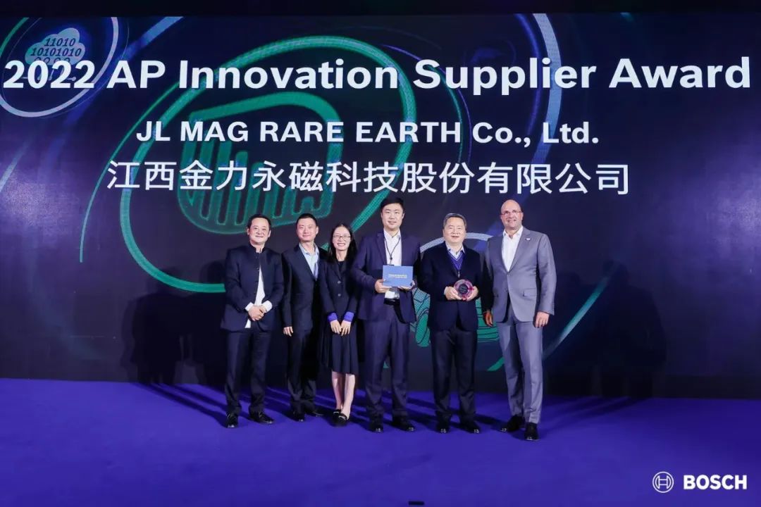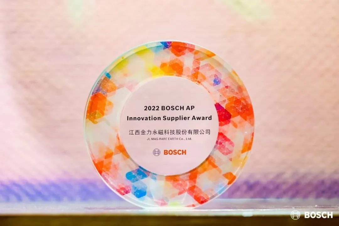本次BOSCH供应商大会设置了2022亚太区优秀供应商奖、2022亚太区潜力供应商奖、2022亚太区创新供应商奖、2022亚太区持续性发展优秀供应商奖四大重要奖项,共有29家供应商获奖。其中,金力永磁荣获BOSCH颁发的2022亚太区创新供应商奖!