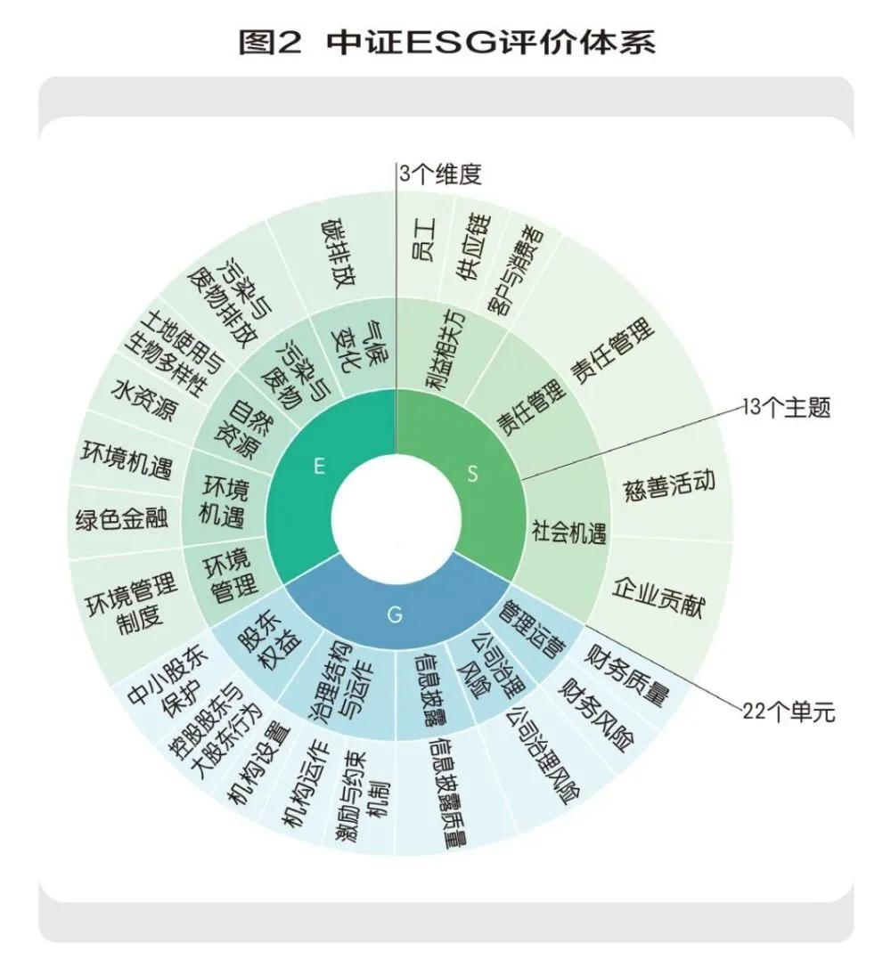 本刊研究系以“中证ESG评价体系”为标准,其包括环境(E)、社会(S)和公司治理(G)三个维度,由13个主题、22个单元和近200个指标构成(图2)。按照该体系,宁德时代对涵盖气候变化、污染与废物、股东权益、公司治理风险、社会机遇、责任管理、利益相关方等13个主题均有进行不同程度的信息披露,整体来看,其2022年ESG报告相对标准。