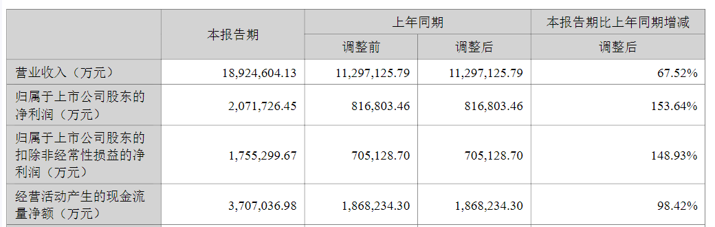 财报显示,宁德时代2023年上半年实现营收1892.5亿元,同比增长67.52%;实现归母净利润207.17亿元,同比增长153.64%。
