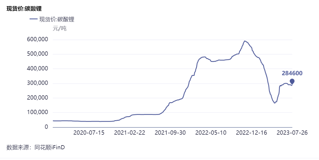 2022年11月初,锂电池的主要材料之一碳酸锂价格一度逼近60万元/吨,此后大幅波动,至2023年4月下旬,数月间又跌破17万元/吨,随后价格才逐步企稳回升,近期持续在28万元~29万元/吨之间震荡。