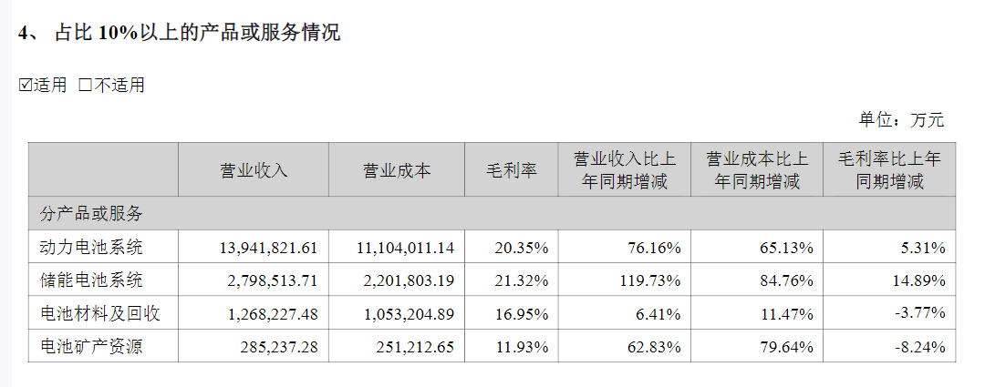 从具体业务来看,2023年上半年,宁德时代动力电池相关业务实现营业收入1394.18亿元,是其核心业务,毛利率同比增长5.31%。同样实现毛利率增长的还有储能电池业务,毛利率同比大幅增长14.89%。而电池材料及回收、电池矿产资源两项业务的毛利率则分别同比减少3.77%、8.24%。