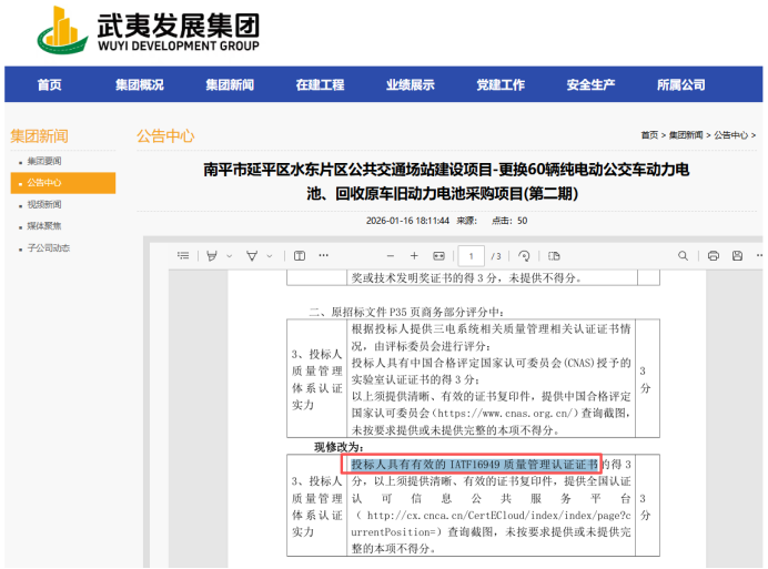 近期在福建南平下辖区域公交公司开展厦门金龙车辆动力电池更换及延保服务的两次招标中,一次已开标项目因金龙新能源因无法与宁德时代就动力电池解决方案及供货达成一致,已采用中创新航的动力电池换下了原厂厦门金龙客车的宁德时代电池;另一次招标公告发布后,即遭到部分报名企业质疑,最终,招标项目延期,招标文件修改为“投标人具有有效的IATF16949质量管理认证证书”条款,这些均成为了宁德时代加速整合售后市场价格及供货渠道的催化剂之一。