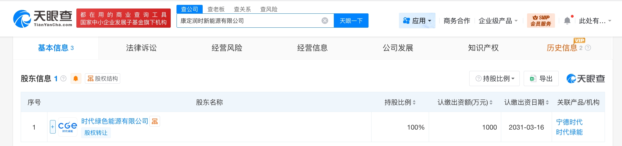 近日,康定润时新能源有限公司成立,法定代表人为王强,注册资本1000万人民币,经营范围包括新兴能源技术研发、储能技术服务、风力发电技术服务、太阳能发电技术服务等。股东信息显示,该公司由宁德时代(300750)旗下时代绿色能源有限公司全资持股。