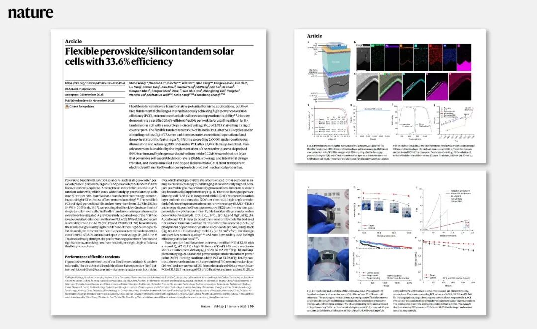 公司与苏州大学、北京工业大学等高校团队合作,成功开发出认证效率高达33.6%的柔性钙钛矿/晶硅异质结叠层太阳能电池。该重磅研究成果发表于Nature,论文题目为《33.6%效率的柔性钙钛矿/硅叠层太阳能电池》("Flexible perovskite/silicon tandem solar cells with 33.6% efficiency")。此项研究攻克了柔性叠层电池在效率与稳定性方面的核心挑战,而柔性叠层电池因其高效、轻质、可弯曲特性,为曲面屋顶、玻璃幕墙等地面光伏及太空能源等特殊应用场景提供了又一能源解决方案。