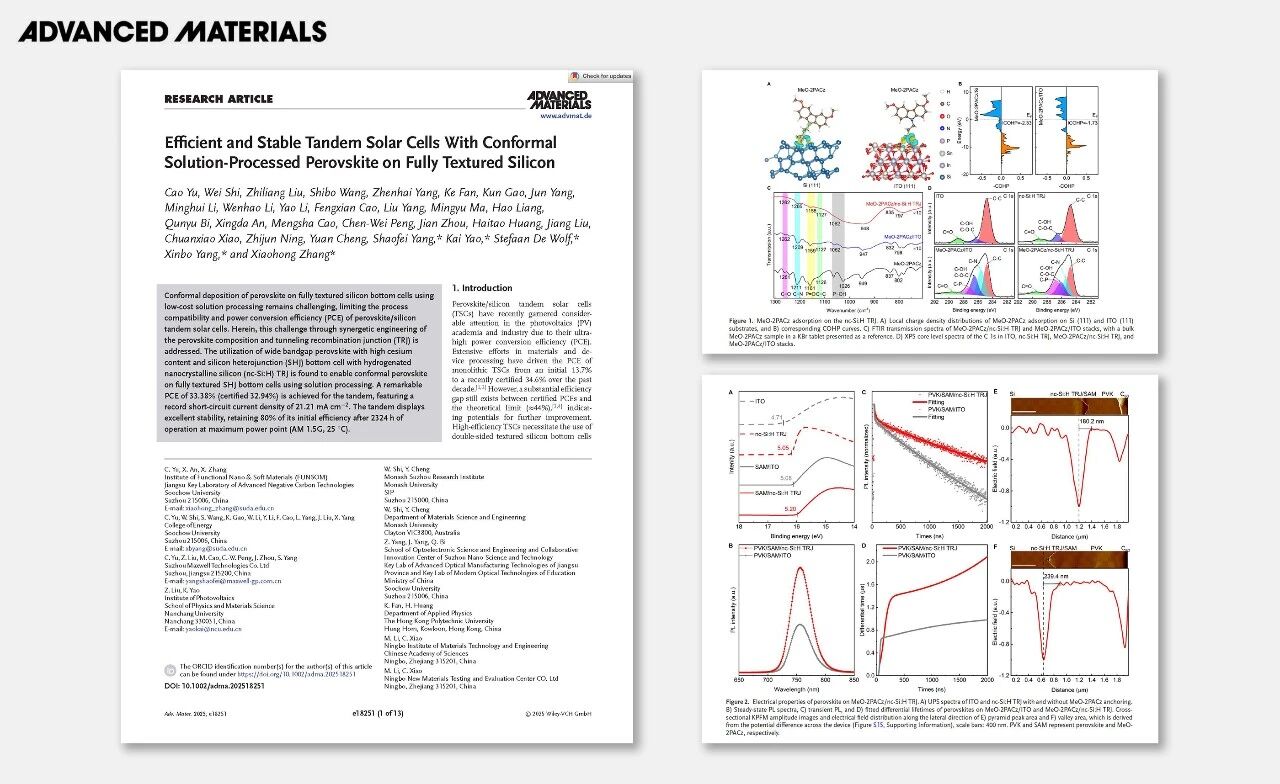 此外,迈为股份联合苏州大学、南昌大学等单位完成的研究,成功刊载于Advanced Materials。论文题为《采用溶液法在全绒面晶硅上共形沉积钙钛矿的高效稳定叠层太阳能电池》("Efficient and Stable Tandem Solar Cells With Conformal Solution-Processed Perovskite on Fully Textured Silicon" )。该研究通过协同优化钙钛矿组分与隧穿复合结结构,成功解决了以低成本溶液法工艺,在全绒面硅基底电池上实现高质量钙钛矿层共形沉积的行业难题。