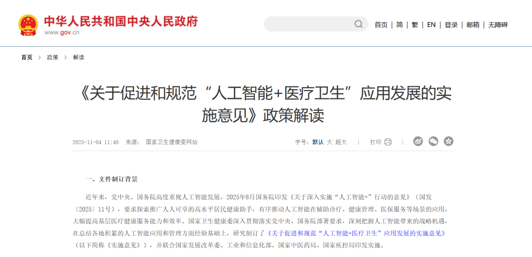 11月4日,国家卫生健康委办公厅正式发布《关于促进和规范“人工智能+医疗卫生”应用发展的实施意见》,这是继2024年《卫生健康行业人工智能应用场景参考指引》之后,国家层面对智能医疗发展的又一系统部署,从“能用”走向“善用”,从单点创新迈向全链协同,也标志着“人工智能+医疗服务”正加速迈入规范化、深层次的应用期。