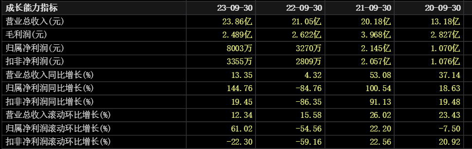 财报显示,第三季度公司营业收入23.86亿元,同比增长13.35%。归属于上市公司股东的净利润0.80亿元,同比增长144.76%。不过,这主要系2023Q3西藏子公司的税费返还影响所致;扣非净利润0.34亿元,同比增长19.45%,主要系产品结构优化、高毛利的精品酒占比提升所致。