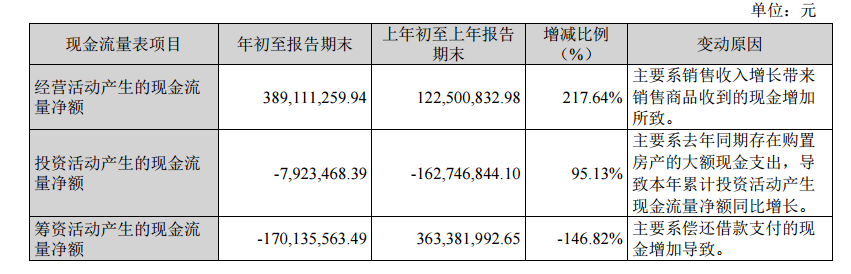 对于投资活动现金流的变化,公司解释称,主要系去年同期存在购置房产的大额现金支出,导致本年累计投资活动产生现金流量净额同比增长。