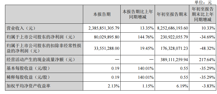3季度扣非归母净利润同增19.45%,前三季度同比下滑48.32%
