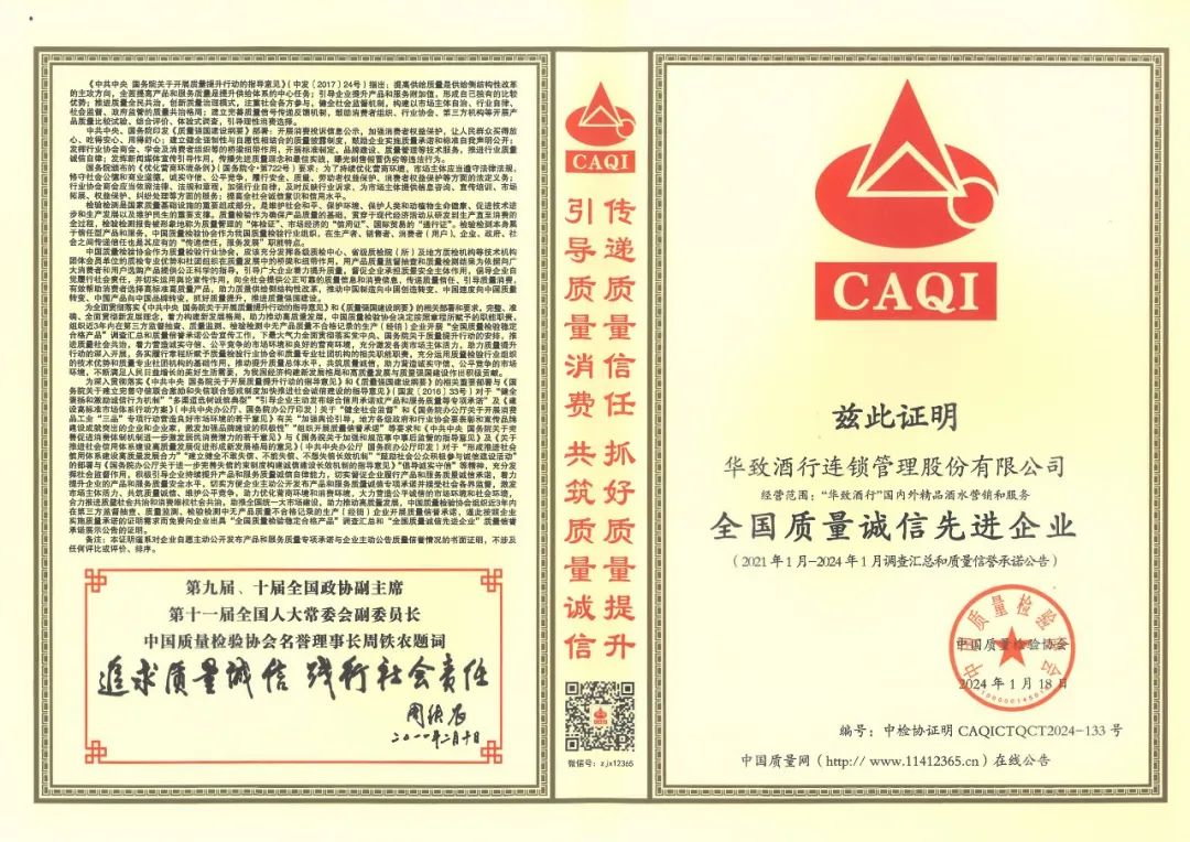 近日,由中国质量检验协会举办的2021-2024调查汇总和质量信誉承诺活动中,华致酒行凭借优质产品及服务再获“全国质量诚信先进企业”、“全国酒品连锁销售行业质量领先品牌”、“全国质量检验稳定合格产品”三项权威认证。