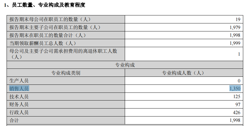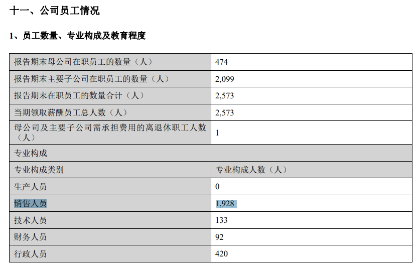 从人数上看,2023年末,公司销售人员为1350人,上年同期为1928人,减少了578人。
