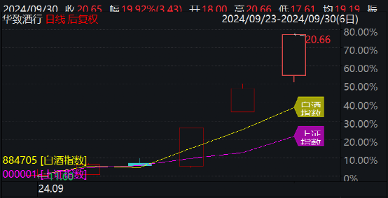 近一周,酒类板块表现抢眼,领跑A股市场。贵州茅台、五粮液等多只酒类股近一周区间涨幅均超过28%,其中华致酒行(300755)股价表现出色,9月23日至9月30日期间涨跌幅累计达到76.49%,成交额12.50亿元,市盈率为23.49倍。9月30日,华致酒行(300755)收盘价为20.65元/股,总市值达到86.09亿元。值得注意的是,9月26日,该公司股价达到20%的涨停,9月30日收盘也几近涨停(涨幅达到19.92%)。这一表现,是市场对华致酒行成长业绩的认可,也对其未来发展潜力充满乐观预期。
