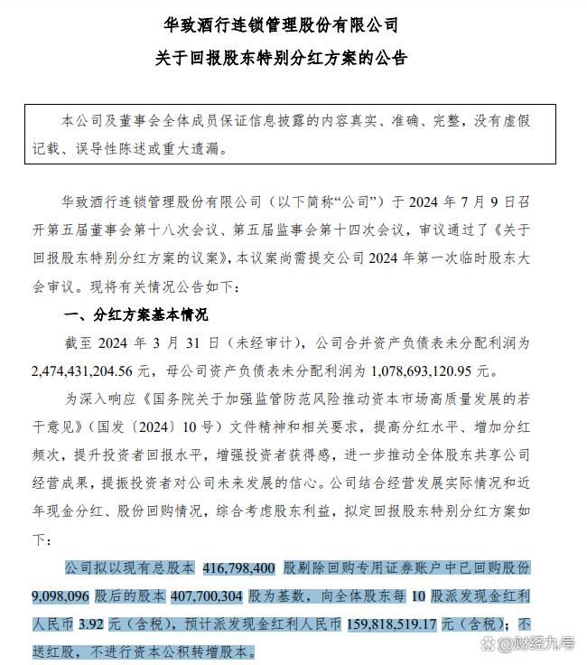 2024年7月9日,也即公司的半年报之前,华致酒行抛出一份近1.6亿元现金的回报股东特别分红方案,根据上市公司的公告称,截至到2024年一季度末,公司账上还有未分配利润24.74亿元,为了积极响应推进资本市场高质量发展的若干建议、提供分红水平、增加分红频次……等等,说了一堆的分红理由。