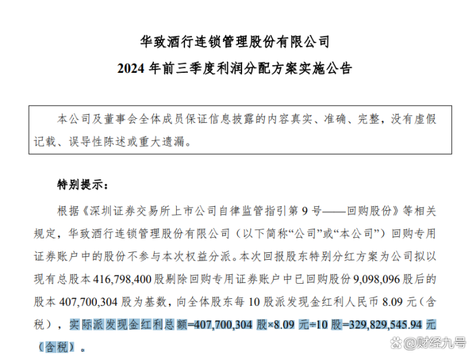到了2024年三季报发布时,华致酒行又罕见地抛出一份3.3亿元的三季度利润分配方案,短短几个月时间,华致酒行竟然进行了两次现金分红,而且一次比一次大,前三季度两次的分红总额达到了同期归母净利润的292%!