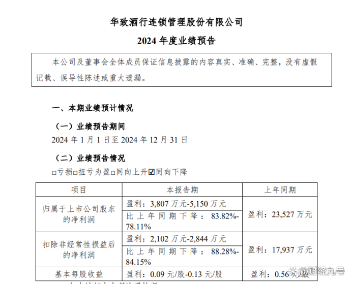 日前华致酒行公布了2024年业绩快报,数据显示,华致酒行2024年归母净利润预计约3807万元至5150万元,同比下降83.82%至78.11%之间,要知道2023年度华致酒行还盈利了2.35亿元的,何至于2024年的业绩如此难看?