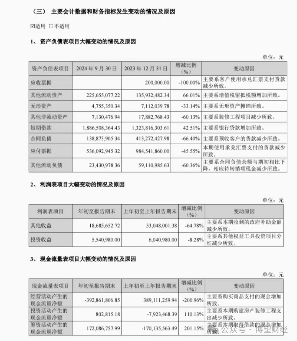 更严峻的是现金流恶化。2024年前三季度,公司经营性现金流净额为-3.93亿元,同比骤降200.96%,而短期债务激增至19亿元,货币资金仅剩8.75亿元。某投行人士直言:“按照当前消耗速度,华致酒行的现金流撑不过2025年第二季度。”