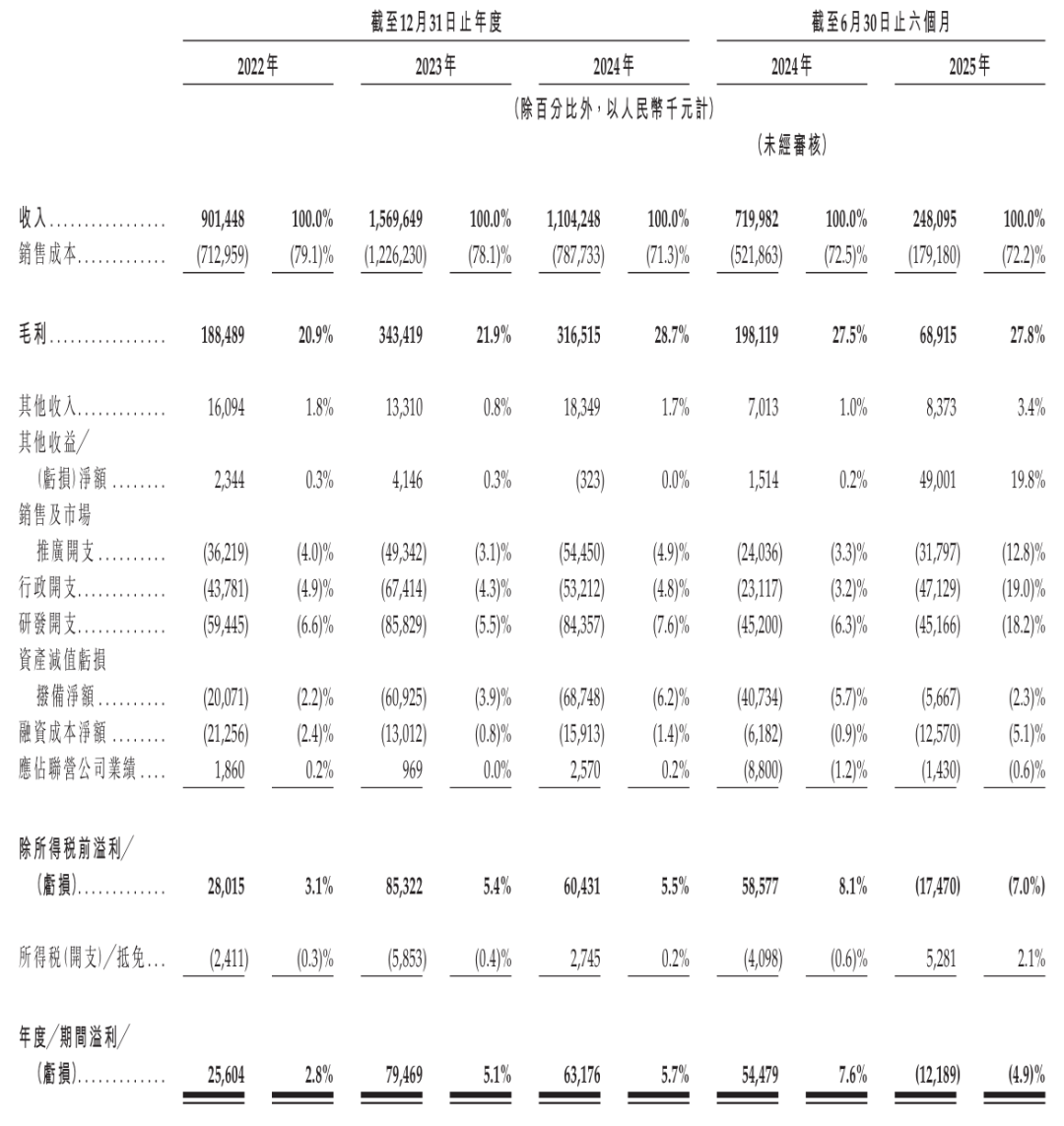 罗博特科2025年上半年营收为2.48亿元,较上年同期的7.2亿元下降65.6%;毛利为6892万元,上年同期的毛利为1.98亿元;期内亏损为1219万元,上年同期的期内利润为5448万元;期内亏损率为4.9%。