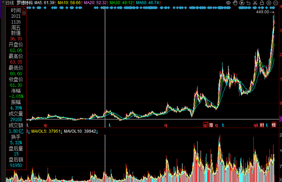 2025年9月18日,罗博特科股价最高冲至306.68元/股,但随后经历回调,到2025年11月,股价已回落至200元/股左右。然而这只是短暂休整。自2025年11月24日的189.21元/股低位开始,罗博特科股价再度起飞,2026年2月9日盘中创下449元/股的历史新高,涨幅约125.7%。