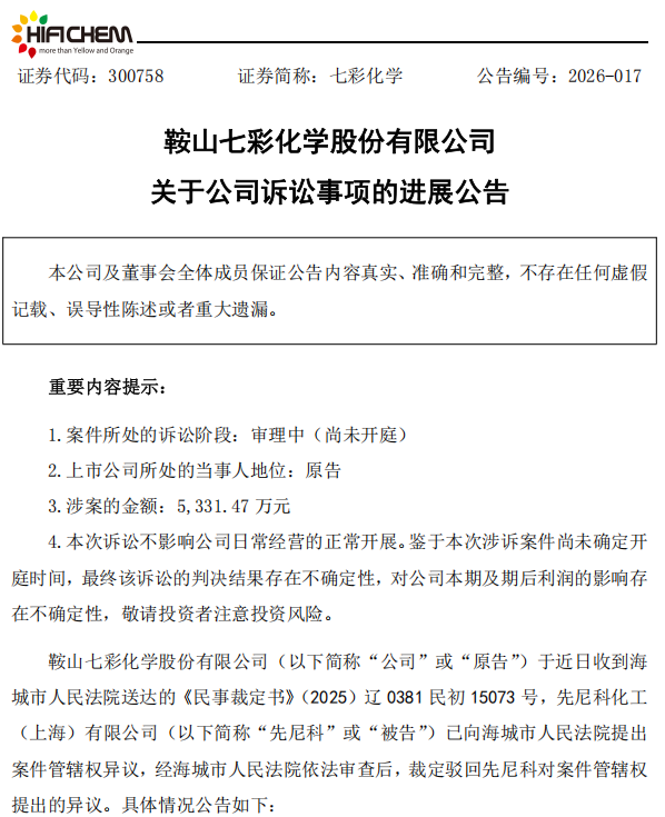 4月9日,七彩化学发布了《鞍山七彩化学股份有限公司关于公司诉讼事项的进展公告》。公告称,鞍山七彩化学股份有限公司近日收到海城市人民法院送达的《民事裁定书》,被告先尼科化工(上海)有限公司(下称先尼科)向海城市人民法院提出的案件管辖权异议被驳回,明确海城市人民法院对本案有具有管辖权。